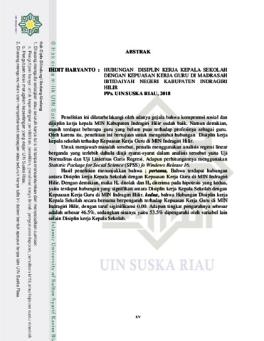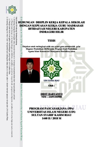 DIDIT HARYANTO, - (2019) HUBUNGAN DISIPLIN KERJA KEPALA SEKOLAH DENGAN KEPUASAN KERJA GURU DI MADRASAH IBTIDAIYAH NEGERI KABUPATEN INDRAGIRI HILIR. Thesis thesis, Universitas Islam Negeri Sultan Syarif Kasim Riau.