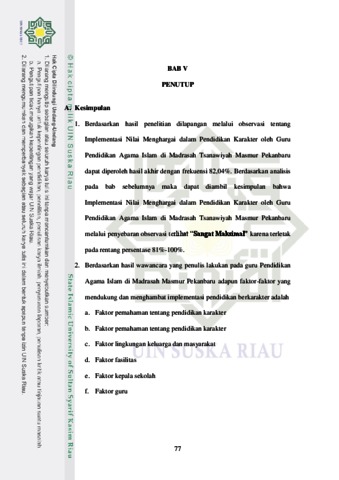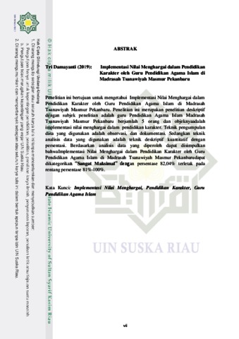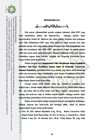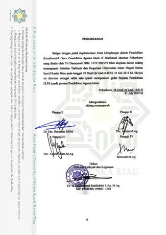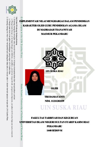 Tri Damayanti, - (2019) IMPLEMENTASI NILAI MENGHARGAI DALAM PENDIDIKAN KARAKTER OLEH GURU PENDIDIKAN AGAMA ISLAM DI MADRASAH TSANAWIYAH MASMUR PEKANBARU. Skripsi thesis, Universitas Islam Negeri Sultan Syarif Kasim Riau.