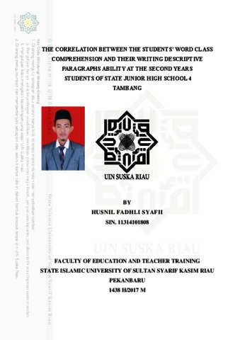 HUSNIL FADHLI SYAFII, 11314101808 (2017) THE CORRELATION BETWEEN THE STUDENTS’ WORD CLASS COMPREHENSION AND THEIR WRITING DESCRIPTIVE PARAGRAPHS ABILITY AT THE SECOND YEARS STUDENTS OF STATE JUNIOR HIGH SCHOOL 4 TAMBANG. Skripsi thesis, Universitas Islam Negeri Sultan Syarif Kasim Riau.