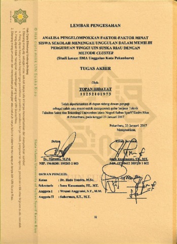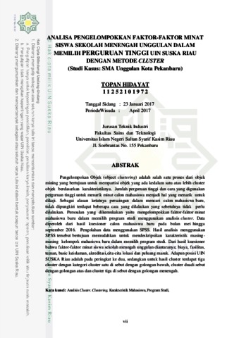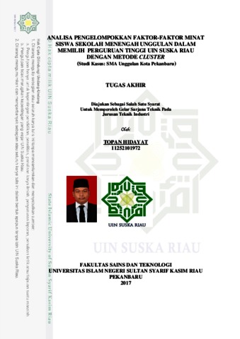 TOPAN HIDAYAT (2017) ANALISA PENGELOMPOKKAN FAKTOR-FAKTOR MINAT SISWA SEKOLAH MENENGAH UNGGULAN DALAM MEMILIH PERGURUAN TINGGI UIN SUSKA RIAU DENGAN METODE CLUSTER(Studi Kasus: SMA Unggulan Kota Pekanbaru). Skripsi thesis, Universitas Islam Negeri Sultan Syarif Kasim Riau.