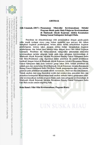 Penelitian ini dilatarbelakangi oleh permasalahan dengan gejala-gejala yaitu masih terdapat siswa yang belum memiliki rasa percaya diri dalam mengikuti kegiatan pembelajaran, belum tekun dalam menjalankan kegiatan pembelajaran, merasa takut ataupun cemas dalam menjalankan kegiatan pembelajaran, dan belum mau bekerja sama dengan siswa lain dalam kegiatan kelompok. Penelitian ini bertujuanuntuk mengetahui penanaman nilai-nilai kewirausahaan melalui program bisnis pada mata pelajaran kewiruasahaan di Madrasah Aliyah Kejuruan Adzakia Kecamatan Batang Gansal Kabupaten Indra Giri Hulu.Pendekatan yang digunakan dalam penelitian ini adalah pendekatan kualitatif dengan lokasi di Madrasah Aliyah Kejuruan Adzakia Kecamatan Batang Gansal Kabupaten Inhu pada semester genap tahun 2016. Subjek penelitian ini adalah guru dan siswa kelas XI di Madrasah Aliyah Kejuruan Adzakia Kecamatan Batang Gansal Kabupaten Indra Giri Hulu.Teknik pengumpulan data yang penulis gunakan pada penelitian ini adalah teknik wawancara, observasi dan dokumentasi. Teknik analisis data yang digunakan terdiri dari reduksi data, penyajian data, dan penarikan kesimpulan.Berdasarkan hasil analisis terbukti bahwa penanaman nilainilai kewirausahaan melalui program bisnis pada mata pelajaran kewiruasahaan di Madrasah Aliyah Kejuruan Adzakia Kecamatan Batang Gansal Kabupaten Indra Giri Hulu secara umum tergolong baik. Kata Kunci: Nilai-Nilai Kewirausahaan, Program Bisnis.