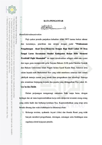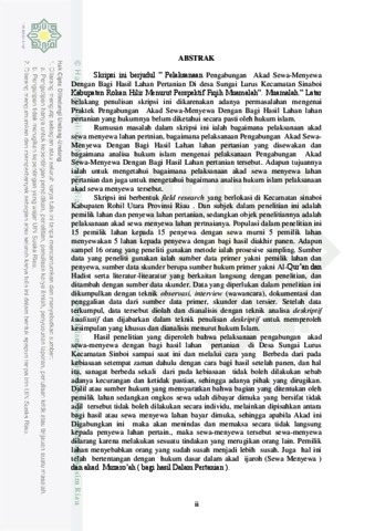 Skripsi ini berjudul ” Pelaksanaan Pengabungan Akad Sewa-Menyewa Dengan Bagi Hasil Lahan Pertanian Di desa Sungai Lurus Kecamatan Sinaboi Kabupaten Rokan Hilir Menurut Perspektif Fiqih Muamalah”. Muamalah.” Latar belakang penulisan skripsi ini dikarenakan adanya permasalahan mengenai Praktek Pengabungan Akad Sewa-Menyewa Dengan Bagi Hasil Lahan lahan pertanian yang hukumnya belum diketahui secara pasti oleh hukum islam. Rumusan masalah dalam skripsi ini ialah bagaimana pelaksanaan akad sewa menyewa lahan pertnian, bagaimana pelaksanaan Pengabungan Akad Sewa-Menyewa Dengan Bagi Hasil Lahan lahan pertanian yang disewakan dan bagaimana analisa hukum islam mengenai pelaksanaan Pengabungan Akad Sewa-Menyewa Dengan Bagi Hasil Lahan pertanian tersebut. Adapun tujuannya ialah untuk mengetahui bagaimana pelaksanaan akad sewa menyewa lahan pertanian dan juga untuk mengetahui bagaimana analisa hukum islam pelaksanaan akad sewa menyewa tersebut. Skripsi ini berbentuk field research yang berlokasi di Kecamatan sinaboi Kabupaten Rohil Utara Provinsi Riau . Dan subjek dalam penelitian ini adalah pemilik lahan dan penyewa lahan pertanian, sedangkan objek penelitiannya adalah pelaksanaan akad sewa menyewa lahan pertnaianya. Populasi dalam penelitian ini 15 pemilik lahan kepada 15 penyewa dengan sewa murni 5 pemilik lahan menyewakan 5 lahan kepada penyewa dengan bagi hasil diakhir panen. Adapun sampel 16 orang yang peneliti gunakan metode ialah prosesive sampling. Sumber data yang peneliti gunakan ialah sumber data primer yakni pemilik lahan dan penyewa, sumber data skunder berupa sumber hukum primer yakni Al-Qur’an dan Hadist serta literatur-litearatur yang berkaitan langsung dengan penelitian, dan ditambah dengan sumber data skunder. Data yang diperlukan dalam penelitian ini dikumpulkan dengan teknik observasi, interview (wawancara), dokumentasi dan penggalian data dari sumber data primer, skunder dan tersier. Setelah data terkumpul, data tersebut diolah dan dianalisis dengan teknik analisa deskriptif kualitatif dan dijabarkan dalam teknik penulisan deskriptif untuk memperoleh kesimpulan yang khusus dan dianalisis menurut hukum Islam. Hasil penelitian yang diperoleh bahwa pelaksanaan pengabungan akad sewa-menyewa dengan bagi hasil lahan pertanian di Desa Sungai Lurus Kecamatan Sinboi sampai saat ini dan melalui cara yang Berbeda dari pada kebiasaan setempat zaman dahulu dengan cara bagi hasil setelah panen, dan hal itu, sanagat berbeda sekali dari pada kebiasaan tidak boleh dilakukan sebab adanya kecurangan dan ketidak pastian, sehingga adanya pihak yang dirugikan. Dalil atau sumber hukum yang mensyaratkan bahwa bagian yang ditentukan oleh pemilik lahan sedangkan ongkos sewa udah dibayar dimuka yang bersifat tidak adil tersebut tidak boleh dilakukan secara individu, melainkan dipisahkan antara bagi hasil atau sewa menyewa lahan bayar dimuka, sehingga apabila Akad ini Digabungkan ini maka akan menindas dan memaksa secara tidak langsung kepada penyewa lahan pertain., maka sewa-menyewa tersebut sewa-menyewa dilarang karena melakukan sesuatu tindakan yang merugikan orang lain. Pemilik lahan menyebabkan orang yang sudah susah menjadi lebih susah. Juga hal ini telah bertentangan dengan hukum dasar dalam akad ijaroh (Sewa Menyewa ) dan akad Muzaro’ah ( bagi hasil Dalam Pertanian ).