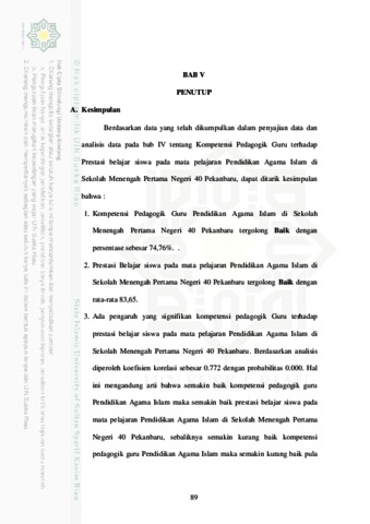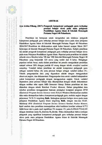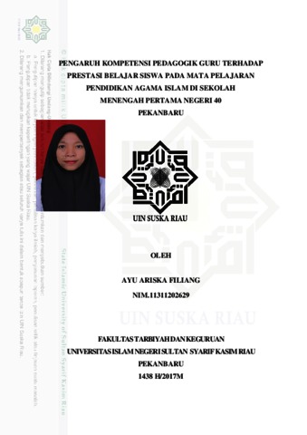 AYU ARISKA FILIANG, 11311202629 (2017) PENGARUH KOMPETENSI PEDAGOGIK GURU TERHADAP PRESTASI BELAJAR SISWA PADA MATA PELAJARAN PENDIDIKAN AGAMA ISLAM DI SEKOLAH MENENGAH PERTAMA NEGERI 40 PEKANBARU. Skripsi thesis, Universitas Islam Negeri Sultan Syarif Kasim Riau.