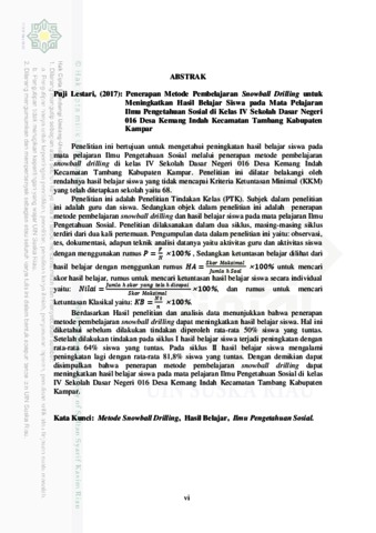 Penelitian ini bertujuan untuk mengetahui peningkatan hasil belajar siswa pada mata pelajaran Ilmu Pengetahuan Sosial melalui penerapan metode pembelajaran snowball drilling di kelas IV Sekolah Dasar Negeri 016 Desa Kemang Indah Kecamatan Tambang Kabupaten Kampar. Penelitian ini dilatar belakangi oleh rendahnya hasil belajar siswa yang tidak mencapai Kriteria Ketuntasan Minimal (KKM) yang telah ditetapkan sekolah yaitu 68. Penelitian ini adalah Penelitian Tindakan Kelas (PTK). Subjek dalam penelitian ini adalah guru dan siswa. Sedangkan objek dalam penelitian ini adalah penerapan metode pembelajaran snowball drilling dan hasil belajar siswa pada mata pelajaran Ilmu Pengetahuan Sosial. Penelitian dilaksanakan dalam dua siklus, masing-masing siklus terdiri dari dua kali pertemuan. Pengumpulan data dalam penelitian ini yaitu: observasi, tes, dokumentasi, adapun teknik analisi datanya yaitu aktivitas guru dan aktivitas siswa dengan menggunakan rumus