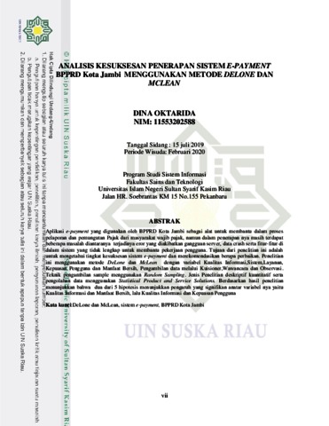 Dina Oktarida, - (2019) ANALISIS KESUKSESAN PENERAPAN SISTEM E-PAYMENT BPPRD Kota Jambi MENGGUNAKAN METODE DELONE DAN MCLEAN. Skripsi thesis, Universitas Islam Negeri Sultan Syarif Kasim Riau.