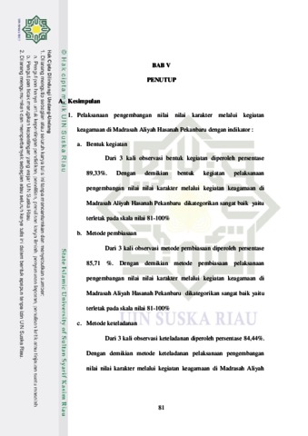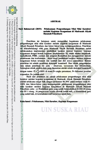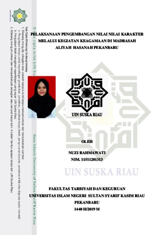 Nuzi Rahmawati, - (2019) PELAKSANAAN PENGEMBANGAN NILAI NILAI KARAKTER MELALUI KEGIATAN KEAGAMAAN DI MADRASAH ALIYAH HASANAH PEKANBARU. Skripsi thesis, Universitas Islam Negeri Sultan Syarif Kasim Riau.