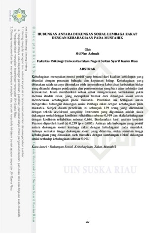 SITI NUR AZIMAH (2017) HUBUNGAN ANTARA DUKUNGAN SOSIAL LEMBAGA ZAKAT DENGAN KEBAHAGIAAN PADA MUSTAHIK. Skripsi thesis, Universitas Islam Negeri Sultan Syarif Kasim Riau.