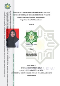 Femila Putri (2019): Implementasi Etika Bisnis terhadap Kepuasan Konsumen Ditinjau Menurut Ekonomi Syariah (Studi Kasus: Sales Promotion pada Samsung Experience Store Mall Pekanbaru). Penelitian ini dilatar belakangi oleh pengamatan penulis tentang implementasi etika bisnis sales promotion terhadap kepuasan konsumen. Rumusan masalah dalam penelitian ini adalah: bagaimana implementasi etika bisnis oleh sales promotion pada Samsung Experience Store Mall Pekanbaru. Bagaimana kepuasan kosumen terhadap etika bisnis sales promotion pada Samsung experience store mall pekanbaru. Bagaimana tinjauan ekonomi syariah terhadap implementasi etika bisnis terhadap kepuasan konsumen ditinjau menurut ekonomi syariah pada sales promotion Samsung experience store mall pekanbaru. Penelitian ini bersifat lapangan, maka dalam pengumpulan data penulis menggunakan teknik observasi, wawancara, angket dan dokumentasi. Sebagai data primer adalah data yang secara langsung diperoleh dari responden, yaitu pembeli atau konsumen di Samsung Experience Store Mall Pekanbaru, sedangkan data sekunder adalah berupa data yang diambil dari beberapa buku buku yang berhubungan dengan permasalahan yang diteliti. Yang menjadi populasi pada penelitian ini berjumlah 4 orang sales promotion dan tidak diketahui jumlahnya dari pihak pembeli dengan menggunakan metode prosedur sampling. Dalam penelitian ini terdapat 6 item pertanyaan. Jadi jumlah sampel yang diambil dalam penelitian ini adalah 24 sampel (6 item pertanyaan x 4) dan dalam penelitian ini peneliti hanya mengambil 4 orang sales promotion. Jadi total dari semua sampelnya ialah 28 orang. Sedangkan metode analisa data yang digunakan dalam penelitian ini adalah metode analisa deskriptif kualitatif yaitu analisa data yang bersifat penjelasan dari data data dan informasi yang berkaitan dengan teori dan konsep-konsep yang mendukung pembahasan, dimana pembahasan ini menggunakan metode kualitatif yang digambarkan dengan kata kata atau kalimat untuk memperoleh kesimpulan. Berdasarkan hasil penelitian, Implentasi etika bisnis oleh sales promotion pada Samsung Experience Store melakukan etka bisnis dengan nilai-nilai etika bisnis yaitu kejujuran, keadilan, rendah hati, simpatik dan kecerdasan. Dengan menggunakan nilai-nilai etika bisnis tersebut terlihatnya pengaruh terhadap kepuasan kosumen.Kepuasan konsumen terhadap etika bisnis sales promotin yang diperoleh dari kriteria mengukur kepuasan konsumen, yaitu kesetiaan, keluhan (komplain) dan partisipasi, dapat disimpulkan bahwa secara keseluruhan sales prootion Samsung Experience Store sudah menerapkan etika bisnis yang baik. Pada umumnya konsumen merasa puas dengan etika bisnis sales promotin meskipun ada sebagian konsumen yang mengalami keluhan dan merasa pelayanan sales belum sesuai dengan etika bisnis.Berdasarkan tinjauan ekonomi syariah implementasi etika bisnis sangat erat hubungannya dengan islam. Landasan mengenai etika bisnis banyak terkandung didalam Al-Quran dan Hadist. Apabila etika bisnis yang dijalankan sesuai dengan konsep etika binis islam yaitu sidiq, fathanah, tabliq, amanah maka akan meningkatkan kepercayaan, keuntungan, dan kepuasan bagi pelanggan.