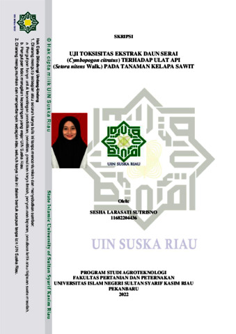 SESHA LARASATI SUTRISNO, - (2022) UJI TOKSISITAS EKSTRAK DAUN SERAI (Cymbopogon citratus) TERHADAP ULAT API (Setora nitens Walk.) PADA TANAMAN KELAPA SAWIT. Skripsi thesis, UIN SULTAN SYARIF KASIM RIAU.