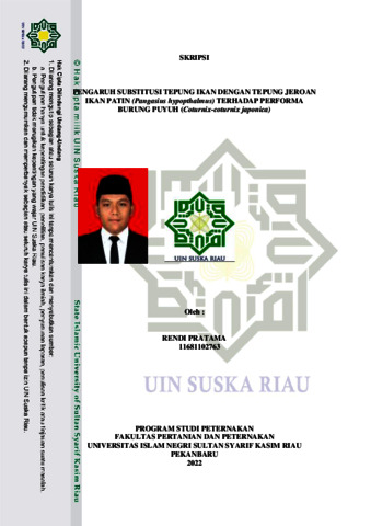 RENDI PRATAMA, - (2022) PENGARUH SUBSTITUSI TEPUNG IKAN DENGAN TEPUNG JEROAN IKAN PATIN (Pangasius hypopthalmus) TERHADAP PERFORMA BURUNG PUYUH (Coturnix-coturnix japonica). Skripsi thesis, UIN SULTAN SYARIF KASIM RIAU.