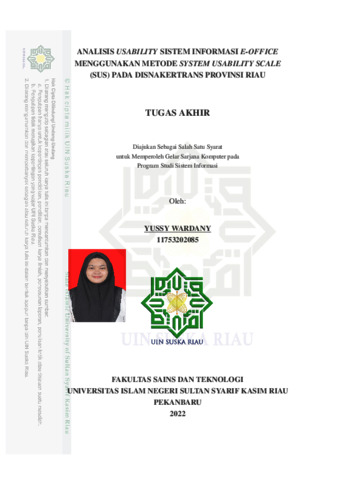 ANALISIS USABILITY SISTEM INFORMASI E-OFFICE MENGGUNAKAN METODE SYSTEM USABILITY SCALE (SUS) PADA DISNAKERTRANS PROVINSI RIAU YUSSY WARDANY NIM: 11753202085 Tanggal Sidang: 22 Juli 2022 Periode Wisuda: Program Studi Sistem Informasi Fakultas Sains dan Teknologi Universitas Islam Negeri Sultan Syarif Kasim Riau Jl. Soebrantas, No. 155, Pekanbaru ABSTRAK Dalam rangka menunjang pengembangan dan pelaksanaan e-government, Disnakertrans Provinsi Riau telah menerapkan e-office. Menu-menu yang terdapat pada e-office yaitu e-spj, e-absen, e-surat, e- izin, e-spt, e-agenda, dan e-cuti. Selama penerapan e-office tedapat kendala kesulitan ketika mengoperasikan e-office. Sehingga untuk pengurusan surat menyurat yang seharusnya bisa dilakukan melalui e-office belum bisa terealisasikan sebagaimana mestinya. Kendala lainnya yaitu menu e-cuti yang belum digunakan karena tidak sinkronnya penghitungan data cuti dari tahun-tahun sebelumnya. Tampilan dan settingan pada menu e-surat yang sulit dipahami dibagian pengaturan tulisan dan juga kop surat sehingga mengakibatkan pengguna e-office mengalami kesulitan dan menyebabkan e-office tidak berjalan dengan baik. Tujuan penelitian ini untuk mengetahui tingkat usability e-Office bagi pengguna di Disnak ertrans Provinsi Riau menggunakan metode System Usability Scale (SUS)dengan 10 pernyataan. Hasil pengukuran acceptability ranges sebesar 65,3. Artinya penerimaan e-office telah masuk ke dalam kategori tinggi atau Marginal High. Sedangkan penilaian pengukuran Grade Scale e-office tergolong bagian D dengan rating OK. Nilai pengukuran Percentile Rank masuk dalam huruf D yang artinya kurang sesuai dengan penilaian pengguna dari menggunakan e-office. Kata Kunci: E-government, E-office, System Usability Scale, Usability