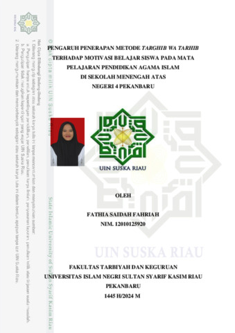 ABSTRAK Fathia Saidah, (2024): Pengaruh Penerapan Metode Targhib Wa Tarhib terhadap Motivasi Belajar Siswa pada Mata Pelajaran Pendidikan Agama Islam di SMA Negeri 4 Pekanbaru Penelitian ini bertujuan untuk menguji pengaruh metode targhib wa tarhib terhadap motivasi belajar siswa pada mata pelajaran Pendidikan Agama Islam di Sekolah Menengah Atas Negeri 4 Pekanbaru. Jenis penelitian ini merupakan penelitian Quasy Eksperimen Design dengan rancangan penelitian Non-equivalent Control Grup Design. Sampel penelitian ini berjumlah 60 siswa, terdiri dari 30 siswa kelas eksperimen dan 30 siswa kelas kontrol. Teknik pengumpulan data menggunakan observasi, angket, dan dokumentasi. Teknik analisis data menggunakan test-t (independent-samples t test). Berdasarkan hasil penelitian dapat disimpulkan bahwa terdapat pengaruh yang signifikan metode targhib wa tarhib terhadap motivasi belajar siswa pada mata pelajaran Pendidikan Agama Islam di Sekolah Menengah Atas Negeri 4 Pekanbaru dengan thitung 3,653 > ttabel 2,00. Sedangkan dengan nilai signifikannya (2-tailed) sebesar 0,001 < 0,05 maka dapat disimpulkan bahwa Ha diterima dan H0 ditolak. Kata Kunci: Metode Targhib Wa Tarhib, Motivasi Belajar