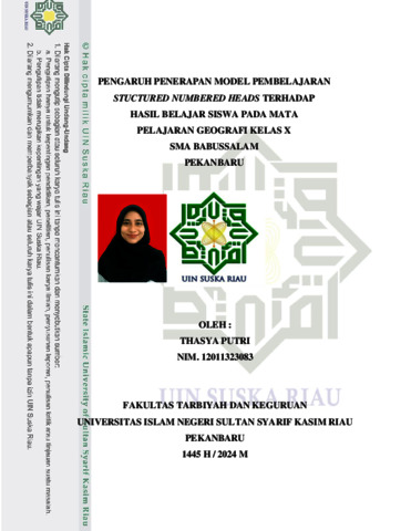 THASYA PUTRI, - (2024) PENGARUH PENERAPAN MODEL PEMBELAJARAN STUCTURED NUMBERED HEADS TERHADAP HASIL BELAJAR SISWA PADA MATA PELAJARAN GEOGRAFI KELAS X SMA BABUSSALAM PEKANBARU. Skripsi thesis, UNIVERSITAS ISLAM NEGERI SULTAN SYARIF KASIM RIAU.