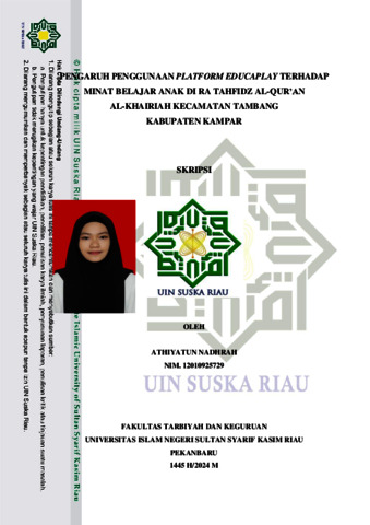 ATHIYATUN NADHRAH, - (2024) PENGARUH PENGGUNAAN PLATFORM EDUCAPLAY TERHADAP MINAT BELAJAR ANAK DI RA TAHFIDZ AL-QUR’AN AL-KHAIRIAH KECAMATAN TAMBANG KABUPATEN KAMPAR. Skripsi thesis, UNIVERSITAS ISLAM NEGERI SULTAN SYARIF KASIM RIAU.