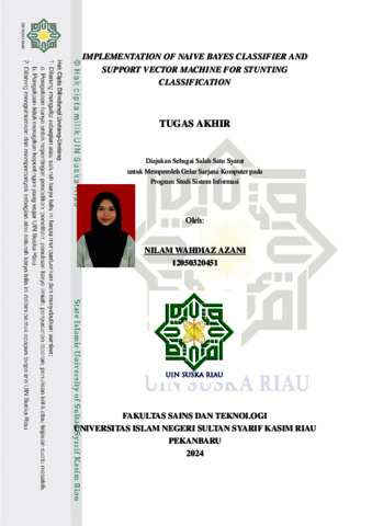 NILAM WAHDIAZ AZANI, - IMPLEMENTATION OF NAIVE BAYES CLASSIFIER AND SUPPORT VECTOR MACHINE FOR STUNTING CLASSIFICATION IMPLEMENTATION OF NAIVE BAYES CLASSIFIER AND SUPPORT VECTOR MACHINE FOR STUNTING CLASSIFICATION. Indonesian Journal of Computer Science, 13. ISSN 2549-7286 (Submitted)