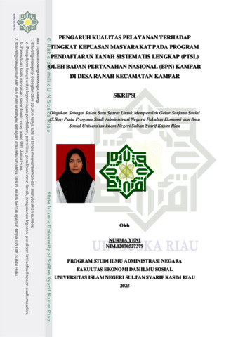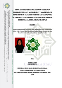 NURMA YENI, - (2025) PENGARUH KUALITAS PELAYANAN TERHADAP TINGKAT KEPUASAN MASYARAKAT PADA PROGRAM PENDAFTARAN TANAH SISTEMATIS LENGKAP (PTSL) OLEH BADAN PERTANAHAN NASIONAL (BPN) KAMPAR DI DESA RANAH KECAMATAN KAMPAR. Skripsi thesis, UNIVERSITAS ISLAM NEGERI SULTAN SYARIF KASIM RIAU.