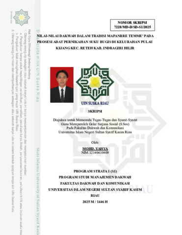 MOHD. YAHYA, - (2025) NILAI-NILAI DAKWAH DALAM TRADISI MAPANRRE TEMME’ PADA PROSESI ADAT PERNIKAHAN SUKU BUGIS DI KELURAHAN PULAU KIJANG KEC. RETEH KAB. INDRAGIRI HILIR. Skripsi thesis, Universitas Islam Negeri Sultan Syarif Kasim Riau.