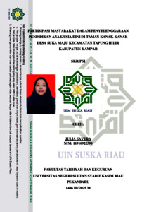 JULIA SAVERA, - (2025) PARTISIPASI MASYARAKAT DALAM PENYELENGGARAAN PENDIDIKAN ANAK USIA DINI DI TAMAN KANAK-KANAK DESA SUKA MAJU KECAMATAN TAPUNG HILIR KABUPATEN KAMPAR. Skripsi thesis, UNIVERSIITAS ISLAM NEGERI SULTAN SYARIF KASIM RIAU.