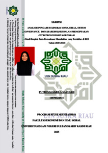 ABSTRAK ANALISIS PENGARUH KINERJA MANAJERIAL, SISTEM GOVERNANCE, DAN SHAREHOLDER DALAM MENCIPTAKAN ENTREPRENEURSHIP KORPORASI (Studi Empiris Pada Perusahaan Manufaktur yang Terdaftar di BEI Tahun 2020-2022) Oleh: Putri Salsabila Sauqiah NIM: 11870324334 Penelitian ini bertujuan untuk menganalisis pengaruh kinerja manajerial, sistem tata kelola, dan peran pemegang saham terhadap pengembangan entrepreneurship korporasi pada perusahaan manufaktur yang terdaftar di Bursa Efek Indonesia (BEI) selama periode 2020–2022. Latar belakang penelitian ini adalah pentingnya inovasi, pengambilan keputusan strategis, dan tata kelola perusahaan dalam menghadapi dinamika bisnis global yang semakin kompleks. Penelitian ini menggunakan pendekatan kuantitatif dengan metode purposive sampling, menghasilkan 49 perusahaan sebagai sampel. Data dianalisis menggunakan regresi linier berganda untuk mengevaluasi pengaruh variabel independen terhadap entrepreneurship korporasi. Hasil penelitian menunjukkan bahwa variabel kinerja manajerial dan variabel shareholder memiliki pengaruh signifikan terhadap entrepreneurship korporasi, sistem governance tidak berpengaruh signifikan terhadap entrepreneurship korporasi. Sedangkan seluruh variabel independent berpengaruh signifikan secara bersama-sama terhadap variabel dependen. Yang artinya menyatakan kinerja manajerial, sistem governance, dan shareholder berpengaruh secara simultan terhadap entrepreneurship korporasi. Penelitian ini memberikan kontribusi penting dalam memperluas literatur terkait faktor-faktor strategis yang memengaruhi keberhasilan perusahaan dalam menciptakan inovasi berkelanjutan dan mempertahankan keunggulan kompetitif di sektor manufaktur. Kata Kunci: entrepreneurship korporasi; kinerja manajerial; sistem governance; shareholder