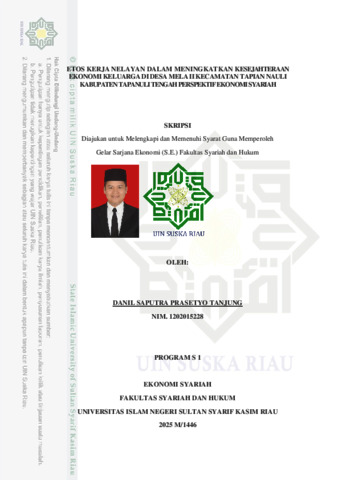 ABSTRAK Danil Saputra Prasetyo Tanjung, (2025): Etos Kerja Nelayan Dalam Meningkatkan Kesejahteraan Ekonomi Keluarga Di Desa Mela II Kecamatan Tapian Nauli Kabupaten Tapanuli Tengah Perspektif Ekonomi Syariah Penelitian ini dilatarbelakangi oleh pendapatan nelayan yang sangat dipengaruhi oleh hasil tangkapan mereka, yang sering kali tidak menentu karena berbagai faktor. Penelitian ini mengkaji peran etos kerja nelayan dalam meningkatkan kesejahteraan ekonomi keluarga di Desa Mela II, Kecamatan Tapian Nauli, Kabupaten Tapanuli Tengah, perspektif Ekonomi Syariah. Fokus utama penelitian ini adalah bagaimana etos kerja nelayan berkontribusi terhadap kesejahteraan ekonomi keluarga serta hal tersebut dianalisis menurut perspektif Ekonomi Syariah. Adapun tujuan penelitian ini adalah memahami penerapan nilai-nilai Islam dalam etos kerja nelayan sehari-hari serta dampaknya terhadap kesejahteraan ekonomi keluarga mereka. Penelitian ini menerapkan metode penelitian lapangan dengan pendekatan kualitatif yang dilakukan di Desa Mela II. Pengumpulan data dilakukan melalui observasi, wawancara, dan dokumentasi, menggunakan sumber data primer dan sekunder. Informan dalam penelitian ini terdiri dari 10 nelayan beragama Islam. Analisis data dilakukan dengan pendekatan deskriptif kualitatif. Hasil penelitian mengungkapkan bahwa etos kerja nelayan di Desa Mela II dalam meningkatkan kesejahteraan ekonomi keluarga dapat dikatakan baik, yang tercermin dari pemenuhan indikator seperti pendapatan, pendidikan, kesehatan, dan perumahan. Dari perspektif Ekonomi Syariah, etos kerja nelayan berperan dalam meningkatkan kesejahteraan ekonomi keluarga. Namun, kesejahteraan yang dicapai masih terbatas pada pemenuhan kebutuhan dharuriyat dan hajiyat, sementara kebutuhan tahsiniyat belum sepenuhnya terpenuhi. Kata kunci: Etos Kerja, Kesejahteraan Ekonomi Keluarga, Nelayan, Ekonomi Syari’ah.