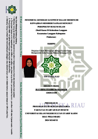 ABSTRAK Suci Irna Syahri Ramadhani (2024): Fenomena Generasi Sandwich Dalam Memenuhi Kewajiban Memberi Nafkah Menurut Perspektif Hukum Islam (Studi Kasus Kelurahan Langgam Kecamatan Langgam Kabupaten Pelalawan) Pada zaman sekarang banyak anak muda berusia 20-an dan 30-an menjadi tulang punggung keluarga untuk menghidupi orang tua atau saudaranya sehingga tidak dapat menikmati masa mudanya dengan baik karena harus terus menerus memikirkan ekonomi keluarga. Orang-orang yang bekerja umtuk memenuhi kebutuhan orangtua dan keluarganya disebut Sandwich Generation (Generasi Sandwich). Latar belakang keluarga dapat mempengaruhi kehidupan seseorang setelah menikah, keterlibatan keluarga dari pihak pasangan tentu akan berdampak pada pernikahan. Hal ini dapat dilihat dari hubungan keluarga orang tua dan keluarga anak pada masyarakat Kelurahan Langgam. Fenomena keterlibatan orang tua dalam rumah tangga anak terutama dalam hal nafkah sebagai bentuk tanggung jawab anak pasca menikah banyak terjadi pada rumah tangga anak yang bertempat tinggal berdekatan atau masih dalam satu rumah dengan keluarga orang tua. Metode penelitian ini menggunakan metode penelitian kualitatif, lokasi penelitian di lakukan di kelurahan Langgam kecamatan Langgam kabupaten Pelalawan. Subjek penelitian ialah 5 orang suami dan juga sebagai anak yang memiliki orangtua. Adapun sumber datanya terdiri dari data primer dan data sekunder antara lain adalah kitab-kitab fiqih dan buku-buku hukum dan literatur lainnya. Metode pengumpulan data yang digunakan yaitu melalui metode observasi, wawancara, dan dokumentasi. Hasil dari penelitian ini dapat dikemukakan bahwa dalam pemenuhan nafkah oleh generasi sandwich di Kelurahan Langgam selain mencukupi kebutuhan anak dan istrinya juga memperhatikan kondisi orang tua dan adik mereka dalam memenuhi nafkah. Mayoritas generasi sandwich di Kelurahan Langgam memang tidak tinggal satu atap dengan orang tua namun mereka memilih menjadikan orangtua sebagai prioritas utamanya dengan alasan tertentu dalam pemenuhan nafkah. Dengan demikian, hendaknya para pasangan yang akan menikah harus mempersiapkan mental, psikologis, ekonomi, dan perencanaan kehidupan agar anak-anak mereka dimasa mendatang tidak ikut merasakan kesusahan dalam menjadi generasi sandwich sekaligus bisa merubah kehidupan yang lebih baik. Kata Kunci: Fenomena, Generasi Sandwich, Hukum Islam
