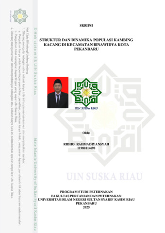 STRUKTUR DAN DINAMIKA POPULASI KAMBING KACANG DI KECAMATAN BINAWIDYA KOTA PEKANBARU Ridho Rahmadiyansyah Di bawah bimbingan Restu Misrianti dan Elfawati INTISARI Sistem pemeliharaan kambing kacang di Kecamatan Binawidya Kota Pekanbaru masih pada jenis peternakan rakyat berskala kecil dan merujuk pada sistem pemeliharaan konvensional. Penelitian ini bertujuan untuk mengetahui struktur dan dinamika populasi ternak kambing kacang di Kecamatan Binawidya Kota Pekanbaru. Penelitian ini telah dilaksanakan pada bulan Juni sampai dengan Agustus 2023 yang berlokasi di Kecamatan Binawidya Kota Pekanbaru. Metode yang digunakan dalam penelitian ini adalah metode survei pada 35 peternak kambing kacang. Peubah dalam penelitian ini adalah karakteristik peternak, struktur populasi dan dinamika populasi. Hasil penelitian ini adalah peternak kambing kacang di Kecamatan Binawidya 100% berjenis kelamin laki laki dengan rentang umur 15-65 tahun 91,43%, mayoritas peternak memiliki tingkat pendidikan SMP 48,57%, beternak adalah pekerjaan sampingan, pekerjaan utama peternak sebagai buruh 57,14% dan petani/peternak 42,86%, peternak di Kecamatan Binawidya memiliki pengalaman beternak paling banyak 5-10 tahun 62,86%, dengan populasi 1-10 ekor sebanyak 71,43%. Struktur populasi kambing kacang di Kecamatan Binawidya Kota Pekanbaru didominasi kambing kacang betina berkisar 51,79%. Tingkat umur tertinggi pada kambing dewasa yaitu 51,35%. Dinamika populasi kambing kacang di Kecamatan Binawidya mengalami kelahiran tertinggi sebesar 28,48% dan penurunan tertinggi disebabkan oleh penjualan yaitu 31,84% Skor indikator pertumbuhan alami atau Natural Increase populasi kambing kacang di Kecamatan Binawidya sebesar 24,45%. Kata kunci: karakteristik peternak, struktur populasi, dinamika populasi, natural increase