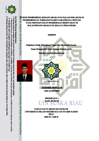 YUHARDI ABDILLAH, - (2025) FUNGSI PEMBIMBING KEMASYARAKATAN DALAM MELAKUKAN PEMBIMBINGAN TERHADAP KLIEN NARAPIDANA DEWASA YANG MENDAPATKAN PEMBEBASAN BERSYARAT DI BALAI PEMASYARAKATAN KELAS I PEKANBARU. Skripsi thesis, UIN SUSKA RIAU.
