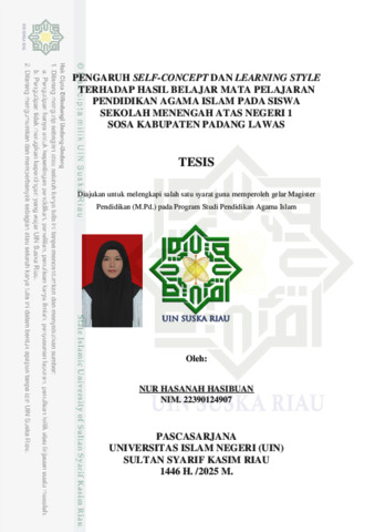 ABSTRAK Nur Hasanah Hasibuan, (2025): Pengaruh Self-Concept dan Learning Style terhadap Hasil Belajar Mata Pelajaran Pendidikan Agama Islam pada Siswa Sekolah Menengah Atas Negeri 1 Sosa Kabupaten Padang Lawas Penelitian ini dilatarbelakangi oleh pemikiran bahwa self-concept dan learning style berpengaruh terhadap hasil belajar siswa mata pelajaran Pendidikan Agama Islam. Penelitian ini bertujuan untuk menguji pengaruh self-concept terhadap hasil belajar siswa, pengaruh learning style terhadap hasil belajar siswa, dan pengaruh self-concept dan learning style secara simultan terhadap hasil belajar siswa SMA Negeri 1 Sosa. Menggunakan pendekatan kuantitatif dengan metode korelasional. Populasinya seluruh siswa SMA Negeri 1 Sosa muslim sejumlah 312 siswa dengan sampel seluruh siswa kelas XII muslim sejumlah 108 siswa dengan tekhnik pengambilan sampel menggunakan purpisive sampling. Teknik pengumpulan data menggunakan angket dan dokumentasi. Teknik analisis data menggunakan uji prasyarat instrument angket: uji validitas dan reliabilitas, uji syarat korelasi berganda: uji normalitas, linearitas, multikolinearitas, dan heteroskedastisitas. Uji hipotesis penelitian: uji t (Parsial), uji F (Simultan), & Koefisien Determinan (R2). Berdasarkan hasil penelitian menunjukkan: Pertama, uji t pada hipotesis I nilai thitung > ttabel (5,563 > 1,982) dan nilai signifikansi (0,000 < 0,05) dapat diinterpretasikan bahwa terdapat pengaruh yang signifikan antara self-concept terhadap hasil belajar siswa dengan nilai Rsquare (R2) sebesar 0,226. Kedua, uji t pada hipotesis II nilai thitung > ttabel (3,912 > 1,982) dan nilai signifikansi (0,000 < 0,05) dapat diinterpretasikan bahwa terdapat pengaruh yang signifikan antara learning style terhadap hasil belajar siswa dengan nilai Rsquare (R2) sebesar 0,126. Ketiga, hipotesis III hasil nilai koefisien determinasi (R2) terdapat pengaruh signifikan secara simultan self-concept dan learning style terhadap hasil belajar siswa dengan kontribusi sebesar 31,8% selebihnya ditentukan oleh variabel lain. Kata Kunci: Self-Concept, Learning Style, Hasil Belajar, Pendidikan Agama Islam