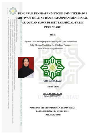 ABSTRAK Mawar Fita Sari (2025) : Pengaruh Penerapan Metode Ummi Terhadap Motivasi Belajar dan Kemampuan Menghafal Al-Qur’an Siswa Di SDIT Tahfidz Al-Fatih Pekanbaru Penelitian ini bertujuan ini untuk mengetahui pengaruh penerapan metode Ummi terhadap motivasi belajar dan kemampuan menghafal al-qur’an siswa di SDIT Tahfidz Al-Fatih pekanbaru. Jenis penelitian ini adalah penelitian kuantitatif korelasional, dengan teknik pengumpulan data menggunakan angket, test lisan dan dokumentasi. Teknik analisis data yang digunakan adalah regresi linier sederhana didukung oleh program SPSS 25. Pengambilan sampel menggunakan teknik total sampling sebanyak 65 orang siswa. Hasil penelitian ini menunjukkan bahwa (1) Terdapat pengaruh penerapan metode Ummi terhadap motivasi belajar siswa di SDIT Tahfidz Al-Fatih pekanbaru, Hal ini berdasarkan perhitungan menggunakan rumus product moment diperoleh pearson correlation > r table sebesar 0,284 > 0,244. Sehingga Ha diterima dan H0 ditolak, maka dapat disimpulkan bahwa terdapat pengaruh metode Ummi terhadap motivasi belajar siswa di SDIT Tahfidz Al- Fatih Pekanbaru. (2) Terdapat pengaruh penerapan metode Ummi kemampuan menghafal al-qur’an siswa di SDIT Tahfidz Al-Fatih pekanbaru, Hal ini berdasarkan perhitungan menggunakan rumus product moment diperoleh pearson correlation > r table sebesar 0,257 > 0,244. Sehingga Ha diterima dan H0 ditolak. Maka dapat disimpulkan bahwa terdapat pengaruh metode Ummi terhadap kemampuan menghafal Al-Qur’an siswa di SDIT Tahfidz Al- Fatih Pekanbaru. (3) Terdapat pengaruh yang signifikan penerapan metode Ummi terhadap motivasi belajar dan kemampuan menghafal al-qur’an siswa di SDIT Tahfidz Al-Fatih pekanbaru, diperoleh nilai signifikan 0,002 (X dan Y1) < 0,05 dan nilai signifikan 0,001 (X dan Y2) < 0,05 sehingga Ha diterima dan H0 ditolak, dengan demikian terdapat pengaruh penerapan metode Ummi terhadap motivasi belajar dan kemampuan menghafal al-qur’an siswa. Kata Kunci: Metode Ummi, motivasi belajar, kemampuan menghafal Al-Qur’an.