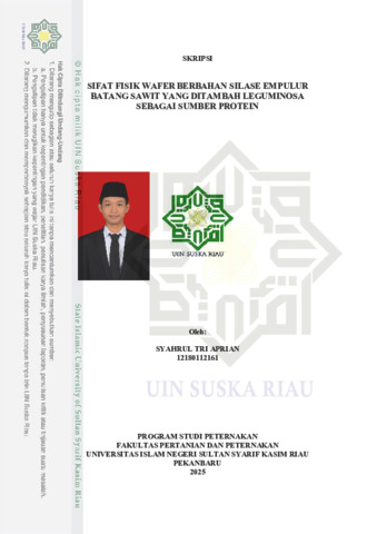 SIFAT FISIK WAFER BERBAHAN SILASE EMPULUR BATANG SAWIT YANG DITAMBAH LEGUMINOSA SEBAGAI SUMBER PROTEIN Syahrul Tri Aprian (12180112161) Di bawah bimbingan Dewi Febrina dan Zumarni INTISARI Empulur batang sawit merupakan limbah pertanian dengan kandungan selulosa 46,22% dan hemiselulosa 19,52% yang berpotensi dimanfaatkan sebagai pakan, tetapi tingginya kandungan lignin 15,41% sehingga perlu diolah menjadi silase. Silase adalah suatu metode pengawetan bahan pakan hijauan yang memanfaatkan proses fermentasi dalam kondisi tanpa oksigen (anaerob). Untuk meningkatkan kualitasnya, silase empulur diproses menjadi wafer, serta ditambahkan leguminosa untuk meningkatkan kandungan protein guna mendukung kesehatan dan produktivitas ternak. Penelitian ini bertujuan untuk mengetahui dampak penambahan leguminosa (indigofera, kalopo dan lamtoro) dalam pembuatan wafer berbahan dasar silase empulur batang sawit terhadap kadar air (KA), kerapatan wafer dan daya serap air (DSA). Penelitian menggunakan rancangan acak lengkap (RAL), 4 perlakuan dan 4 ulangan. Perlakuan adalah : P1: Silase Empulur Batang Sawit (SEBS) + dedak padi halus + daun ubi kayu (kontrol), P2 : P1 + 14% indigofera, P3 : P1 + 15% lamtoro dan P4 : P1 + 14% kalopo. Parameter yang diukur adalah kadar air, kerapatan wafer, daya serap air. Data dianalisis berdasarkan analisis ragam, perbedaan antar perlakuan di uji lanjut dengan DMRT taraf 5%. Hasil penelitian menunjukkan penambahan leguminosa dalam pembuatan wafer memberikan pengaruh yang tidak nyata (P>0,01) terhadap kadar air dan kerapatan namun memberikan pengaruh yang nyata (P<0,05) terhadap daya serap air. Perlakuan P1 (kontrol) menghasilkan kadar air terendah (5,31%). Perlakuan P2 (penambahan 14% indigofera) menghasilkan kerapatan wafer tertinggi (0,687g/cm3). Perlakuan P3 (penambahan 15% lamtoro) menghasilkan daya serap air tertinggi (109,00%). Perlakuan terbaik adalah penambahan indigofera 14% dalam pembuatan wafer karena menghasilkan kadar air (5,32%), kerapatan (0,687 g/cm3) dan daya serap air (104,75%) yang sesuai untuk ternak ruminansia. Kata kunci: Empulur batang sawit, silase, wafer, sifat fisik.