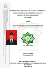 ABSTRAK Ahmad Palihin, 2025: Problematika Implementasi Kurikulum Merdeka pada Mata Pelajaran Fikih di Madrasah Ibtidaiyah 02 Pekanbaru Kurikulum Merdeka yang diusung oleh Kementerian Pendidikan, Kebudayaan, Riset, dan Teknologi bertujuan untuk memperbaiki pembelajaran dengan menyempurnakan kurikulum sebelumnya, namun pelaksanaannya masih menghadapi berbagai kendala. Di Madrasah Ibtidaiyah Muhammadiyah 02 Pekanbaru, meskipun kurikulum ini diperkenalkan, implementasinya belum berjalan optimal, terutama dalam mata pelajaran fikih yang menyimpan sejumlah permasalahan. Penelitian ini bertujuan untuk menjelaskan implementasi kurikulum Merdeka pada pembelajaran fikih, mengidentifikasi permasalahan yang dihadapi oleh guru, serta upaya yang dilakukan oleh Kepala Sekolah dalam mengatasi tantangan tersebut. Penelitian ini menggunakan pendekatan kualitatiflapangan dengan teknik pengumpulan data melalui observasi, wawancara, dan dokumentasi yang dianalisis secara deskriptif-analitis. Hasil penelitian menunjukkan bahwa implementasi kurikulum Merdeka di MI Muhammadiyah 02 Pekanbaru dilakukan melalui dua tahapan: persiapan yang melibatkan pelatihan, workshop, dan seminar, serta tahap pengajaran yang mencakup asesmen diagnostik, tadarus Al-Qur'an, penyampaian materi dengan metode bervariasi, dan penutupan dengan doa bersama. Problematika yang dihadapi mencakup kurangnya pemahaman dan kompetensi guru terkait kurikulum Merdeka, serta kurangnya dukungan dari Kementerian Agama dalam penerapannya di madrasah. Untuk mengatasi permasalahan tersebut, madrasah melakukan diskusi antar guru, meningkatkan pelatihan dan sosialisasi, serta studi banding ke sekolah yang lebih maju dalam implementasi kurikulum ini. Upaya ini mencerminkan transformasi pendidikan fikih yang adaptif dan kontekstual, mengintegrasikan nilai-nilai Islam dengan pendekatan berbasis proyek, dan membuka peluang pengembangan karakter serta kompetensi abad ke-21. Kata Kunci: Problematika, Implementasi, Kurikulum Merdeka, Madrasah Ibtidaiyah Muhammadiyah 02 Pekanbaru