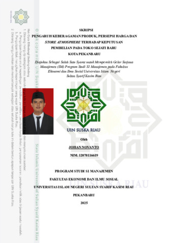 ABSTRAK PENGARUH KEBERAGAMAN PRODUK, PERSEPSI HARGA DAN STORE ATMOSPHERE TERHADAP KEPUTUSAN PEMBELIAN PADA TOKO SEJATI BARUKOTA PEKANBARU Oleh : JOHAN NOVANTO NIM. 12070116619 Keputusan pembelian adalah keputusan final konsumen untuk membeli atau tidaknya suatu barang dan jasa dengan membandingkan banyak pertimbangan. Ketika melakukan keputusan pembelian, seringkali terdapat beberapa pilihan antara dua atau lebih alternatif. Adapun tujuan dilakukannya penelitian ini untuk mengetahui Pengaruh Keragaman Produk, Persepsi Harga, dan Store Atmosphere Terhadap Keputusan Pembelian Pada Toko Sejati Baru Kota Pekanbaru. Populasi dalam penelitian ini berjumlah 100 responden dengan menggunakan metode purposive sampling. Berdasarkan hasil penelitian ini menunjukkan bahwa secara parsial Keragaman Produk, Persepsi Harga, dan Store Atmosphere berpengaruh terhadap keputusan pembelian. Hasil Koefisien Determinasi (R2 ) menunjukkan bahwa besarnya pengaruh dari ketiga variabel bebas secara bersama- sama terhadap variabel terikatnya sebesar 70,8% dan sisanya sebesar 29,2% merupakan variabel lain yang tidak diteliti kedalam penelitian ini Kata Kunci : Keberagaman Produk, Persepsi Harga, Store Atmosphere dan Keputusan Pembelian