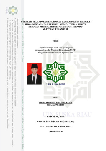 ABSTRAK Muhammad Surya P. (2025): Korelasi Kecerdasan Emosional dan Karakter Religius Siswa dengan Adab Bergaul kepada Teman Sebaya Sekolah Menengah Pertama Islam Terpadu Al-Fityah Pekanbaru Penelitian ini bertujuan untuk menguji korelasi kecerdasan emosional dan karakter religius siswa dengan adab bergaul kepada teman sebaya di Sekolah Menengah Pertama Islam Terpadu Al-Fityah Pekanbaru. Penelitian ini menggunakan pendekatan kuantitatif dengan jenis penelitian korelasi. Populasi dalam penelitian ini adalah 135 orang, dengan pengambilan sampel menggunakan teknik stratified proportional random sampling dan penentuan ukuran sampel menggunakan rumus slovin sehingga jumlah sampel dalam penelitian ini sebanyak 101 orang. Pengumpulan data menggunakan instrument tes, angket, dan dokumentasi. Teknik analisis data yang digunakan yaitu uji korelasi sederhana, berganda, dan parsial. Hasil penelitian menunjukkan bahwa terdapat hubungan yang signifikan kecerdasan emosional dan karakter religius secara simultan dengan adab bergaul kepada teman sebaya dengan korelasi yang sangat kuat (r = 0,912, p < 0,05). Namun, ketika karakter religius dikontrol, kecerdasan emosional tidak lagi memiliki hubungan yang signifikan dengan adab bergaul (p = 0,809 > 0,05). Sebaliknya, ketika kecerdasan emosional dikontrol, karakter religius tetap memiliki hubungan yang signifikan dengan adab bergaul (p = 0,000 < 0,05). Temuan ini menegaskan bahwa karakter religius lebih dominan dibandingkan kecerdasan emosional dalam membentuk adab bergaul seseorang. Dalam perspektif Islam, hal ini menguatkan bahwa nilai-nilai religius berperan sebagai fondasi utama dalam membentuk akhlak dan perilaku sosial individu. Kata Kunci: Kecerdasan Emosional, Karakter Religius, Adab Bergaul kepada Teman Sebaya