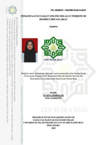 ABSTRAK Nama : Syafna Febriyani Nim : 12140422787 Judul : Pemanfaatan Zakat Online Melalui Website di Dompet Dhuafa Riau Prodi : Manajemen Dakwah Perkembangan teknologi digital telah berkembang begitu pesat sehingga membuka peluang baru dalam pengelolaan zakat, salah satunya melalui layanan platform zakat online. Penelitian ini bertujuan untuk mengetahui pemanfaatan zakat online melalui website di Dompet Dhuafa Riau, yang berfokus pada efektivitas, kemudahan dalam berakses, dan dampak terhadap peningkatan jumlah zakat yang diterima. Metode yang digunakan penelitian adalah dengan pendekatan kualitatif dengan teknik pengumpulan data berupa wawancara, observasi, dan studi dokumentasi. Hasil penelitian ini adalah bahwasanya layanan zakat online melalui website Dompet Dhuafa Riau memberikan kemudahan dan efisiensi dalam membayar zakat. Terdapat juga fitur-fitur yang terdapat pada website seperti kalkulator zakat, kabar berita dan transparansi yang menjadi faktor utama untuk menarik minat muzakki. Selain itu juga, zakat online mampu memperoleh lebih banyak muzakki, termasuk mereka yang tidak berada di wilayah riau. Kesimpulan pada hasil penelitian ini ialah zakat online melalui website sangat mempermudah muzakki dalam menunaikan kewajiban zakatnya dan meningkatkan efektivitas pengelolaan zakat. Penelitian berharap ini dapat menjadi acuan bagi lembaga zakat lain dalam memanfaatkan teknologi digital untuk mendukung pengelolaan zakat yang lebih modern lagi. Kata Kunci: zakat online, website, Dompet Dhuafa Riau, teknologi digital