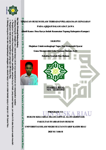ABSTRAK Syamsul Rizal (2025): Tinjauan Hukum Islam Terhadap Pelaksanaan Upacara Sepasaran Pada Aqiqah Dalam Jawa (Studi Kasus: Desa Karya Indah Kecamatan Tapung Kabupaten Kampar) Adat atau dalam Islam dikenal dengan ‘Urf, merupakan sekumpulan norma, kebiasaan, dan praktik yang berkembang dalam kehidupan masyarakat sebagai pedoman dalam berperilaku. Dalam Islam ada ‘Urf saheh dan ‘Urf Fasid, ‘Urf Saheh ialah ‘Urf yang dibolehkan, sedangkan ‘Urf Fasid merupakan ‘Urf yang dilarang. Di Desa Karya Indah terdapat tradisi dalam menyambut hari kelima kelahiran bayi dalam adat jawa, yang dikenal dengan upacara sepasaran. Upacara sepasaran ini pada perakteknya dianggap melenceng dari ajaran Islam, dikarenakan terdapat unsur syirik dan mubazir pada saat pelaksanaannya. Penelitian ini bertujuan untuk mengetahui bagaimana praktek pelaksanaan upacaara sepasaran pada aqiqah di Desa Karya Indah, serta mengkaji pelaksanaannya berdasarkan perspektif hukum Islam. Penelitian ini menggunakan metode kualitatif dengan pendekatan studi lapangan yang mana lokasi penelitiannya berada di Desa Karya Indah. Data primer pada penelitian ini diperoleh melalui wawancara informan, yang mana pada penelitian ini terdapat tiga jenis informan yaitu informan kunci, utama dan pendukung, yang menjadi informan kunci pada penelitian ini berjumlah 12 orang, informan utama berjumlah 6 orang dan informan pendukung berjumlah 15 orang. Data sekunder diperoleh dari kajian pustaka terkait hukum Islam, konsep aqiqah, dan adat sepasaran. Cara memperoleh datanya yaitu melalui observasi dan wawancara lansung bersama informan di Desa Karya Indah. Dari hasil observasi dan wawancara tersebut barulah data tersebut diolah dan dikembangkan menjadi hipotesisi penelitian kemudian dianalisis dan diambil kesimpulan. Hasil penelitian menunjukkan bahwa pelaksanaan aqiqah di Desa Karya Indah sesuai dengan Syariat Islam karena memenuhi ketentuan aqiqah, seperti penyembelihan hewan kambing atau domba sesuai aturan Islam. Sebaliknya, tradisi sepasaran dikategorikan sebagai ‘Urf Fasid (adat yang rusak) karena tradisi sepasaran dinilai mengandung unsur syirik dan mubazir. Syirik dikarenakan memberikan sesajen kepada Kakang Kawah Adi Ari-Ari dalam bentuk penghormatan yang berlebihan, kemudian mubazirnya disebabkan bubur yang dijadikan sesajen untuk Kakang Kawah Adi Ari-Ari tersebut tidak boleh dikonsumsi karena sudah dikhususkan untuk Ari-Ari tersebut. Masyarakat Jawa mempercayai bahwasanya Ari-Ari tersebutlah yang nantinya akan memakan bubur tersebut. Tradisi aqiqah dapat dilestarikan karena sejalan dengan ajaran Islam. Sementara itu, upacara sepasaran perlu untuk direformulasikan yang mana semulanya terdapat unsur syirik maka diganti dengan doa atau kegiatan ibadah yang sesuai dengan ajaran Islam. Kemudian sebagai penganti elemen mubazirnya, maka bubur yang semulanya dibuang maka bisa dioptimalkan dengan menjadikannya sebagai hidangan makan tamu yang hadir. Kata Kunci: Aqiqah, Sepasaran, Adat Jawa, Hukum Islam, ‘Urf.