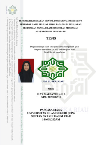 ABSTRAK Alya Mardatillah. B, (2025): Pengaruh Kesehatan Mental dan Coping Stress Siswa Terhadap Hasil Belajar Siswa Pada Mata Pelajaran Pendidikan Agama Islam di SMA Negeri 11 Pekanbaru Penelitian ini bertujuan untuk menganalisis pengaruh kesehatan mental dan coping stress siswa terhadap hasil belajar siswa pada mata pelajaran Pendidikan Agama Islam di SMA Negeri 11 Pekanbaru. Penelitian ini menggunakan pendekatan kuantitatif dengan desain korelasional. Populasinya seluruh siswa muslim di SMA Negeri 11 Pekanbaru yang berjumlah 634 siswa. Sampel penelitian ini adalah siswa muslim kelas XII yang berjumlah 215 orang. Teknik pengumpulan data menggunakan angket dan dokumentasi. Teknik analisis data menggunakan regresi linear sederhana dan regresi linear berganda. Hasil penelitian ini: Pertama, terdapat pengaruh yang signifikan kesehatan mental terhadap hasil belajar siswa pada mata pelajaran Pendidikan Agama Islam di SMA Negeri 11 Pekanbaru dengan nilai RSquare (r2) sebesar 0,151. Kedua, terdapat pengaruh yang signifikan coping stress terhadap hasil belajar siswa pada mata pelajaran Pendidikan Agama Islam di SMA Negeri 11 Pekanbaru dengan nilai RSquare (r2) sebesar 0,185. Ketiga, terdapat pengaruh yang signifikan kesehatan mental dan coping stress secara simultan terhadap hasil belajar siswa pada mata pelajaran Pendidikan Agama Islam di SMA Negeri 11 Pekanbaru dengan nilai RSquare (r2) sebesar 0,239. Kata Kunci: Kesehatan Mental, Coping Stress, Hasil Belajar.