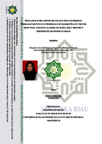ABSTRAK Weni Indriani, (2025) : PENGARUH ETIKA BISNIS ISLAM DAN INOVASI PRODUK TERHADAP KEPUTUSAN PEMBELIAN DI MARKETPLACE TIKTOK SHOP PADA ANGGOTA KAMMI UIN SUSKA MENURUT PERSPEKTIF EKONOMI SYARIAH Penelitian ini dilatarbelakangi oleh pesatnya pertumbuhan bisnis di TikTok Shop sehingga memberikan banyak pilihan kepada masyarakat dalam membuat keputusan pembelian. Di balik pesatnya perkembangan marketplace dan transaksi jual beli online, terdapat sejumlah permasalahan yang sering muncul. Salah satu masalah utama pada transaksi online adalah penipuan, terutama dalam metode pembayaran Cash on Delivery (COD), seperti yang viral di TikTok melalui akun Bagoes Vlog. Kasus ini menggambarkan barang yang diterima tidak sesuai dengan pesanan, yang mengakibatkan menurunnya kepercayaan konsumen terhadap transaksi online. Penelitian ini menggunakan pendekatan deskriptif kuantitatif dengan populasi jumlah Anggota KAMMI dari tahun 2020 – 2023 berjumlah 110 orang. Teknik pengumpulan data menggunakan random sampling dengan Sampel sebanyak 86 responden ditentukan menggunakan teknik slovin. Pengumpulan data dilakukan melalui observasi dan kuesioner. Kemudian dianalisis menggunakan aplikasi SPSS (Stastitical Package For The Social Sciences) 25. Hasil pengujian regresi linear berganda diperoleh persamaan Y = 20,985 - 0,681 X1+ 1,932 X2 + ϵ, Variabel Etika Bisnis Islam mempunyai pengaruh yang signifikan secara parsial terhadap keputusan pembelian di Marketplace Tiktok shop pada anggota KAMMI UIN SUSKA Riau. dengan nilai thitung (-4,548) > ttabel (1,989), dan nilai signifikan 0,000 < 0,05. Variabel inovasi produk dengan nilai thitung (10,170) > ttabel (1,989) dan Sig. 0.000 < 0,05. Artinya Inovasi Produk berpengaruh signifikan secara parsial terhadap Keputusan Pembelian di Marketplace Tiktok shop pada anggota KAMMI UIN SUSKA Riau. Etika Bisnis Islam dan Inovasi Produk memiliki nilai sig Fhitung (54,242) > Ftabel (3,10) dengan nilai Signifikan 0,000 < 0,05. Sehingga artinya secara simultan Etika Bisnis Islam, dan Inovasi Produk memiliki pengaruh signifikan terhadap Keputusan Pembelian di Marketplace Tiktok Shop Pada Anggota KAMMI UIN SUSKA Riau. Berdasarkan nilai Adjusted R square diketahui bahwa variabel Etika Bisnis Islam dan Inovasi Produk memberikan pengaruh atau kontribusi terhadap Keputusan Pembelian sebesar sebesar 56,7% Sementara itu, sisanya 43, 3% dipengaruhi oleh faktor lain. Dalam tinjauan Ekonomi Syariah Etika Bisnis Islam dan Inovasi produk terhadap keputusan pembelian anggota KAMMI UIN SUSKA Riau sudah sesuai dengan prinsip ekonomi syariah, karna dalam mengkonsumsi barang dan jasa mereka cenderung menghindari perilaku boros (israf) dan lebih memilih produk yang memberikan manfaat jangka panjang. Kata Kunci: Etika Bisnis Islam, Inovasi Produk, Keputusan Pembelian