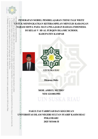 ABSTRAK Moh.Amrul Mutho’ (2025) : Penerapan Model Pembelajaran Think Talk Write untuk Meningkatkan Keterampilan Menulis karangan narasi Siswa pada Muatan Pelajaran Bahasa Indonesia Kelas V di SD Al Furqon Islamic School Kabupaten Kampar. Penelitian ini bertujuan untuk mengetahui peningkatan keterampilan Menulis karangan narasi siswa pada muatan pelajaran Bahasa Indonesia melalui penerapan model pembelajaran Think Talk Write di kelas V SD Al Furqon Islamic School Kabupaten Kampar. Penelitian ini merupakan Penelitian Tindakan Kelas yang subjek penelitiannya adalah 1 guru dan 15 siswa dengan objek penelitiannya adalah model pembelajaran Think Talk Write dan keterampilan menulis siswa. Penelitian ini dilakukan dalam 2 siklus dan setiap siklus terdiri dari dua kali pertemuan. Teknik pengumpulan data yang digunakan adalah analisis deskriptif dan persentase. Hasil penelitian dan analisis data menunjukkan bahwa penerapan model pembelajaran Think Talk Write dapat meningkatkan keterampilan menulis Karangan Narasi siswa. Hal ini dapat diketahui dari grafik peningkatannya sejak pra tindakan hingga tindakan perbaikan pada siklus I dan II. Data pra siklus menunjukkan persentase keterampilan menulis siswa hanya 44% dengan kategori cukup. Setelah dilakukan tindakan perbaikan pembelajaran pada siklus I pertemuan pertama, keterampilan menulis karangan narasi siswa meningkat menjadi 59%, namun masih berada pada kategori cukup, dan pertemuan kedua meningkat menjadi 72% dengan kategori tinggi. Kemudian pada siklus II pertemuan pertama, keterampilan menulis Karangan Narasi siswa meningkat menjadi 83% berada pada kategori sangat tinggi, dan pada siklus II pertemuan kedua persentase keterampilan menulis siswa meningkat menjadi 88% dan berada pada kategori sangat tinggi. Dengan demikian dapat disimpulkan bahwa penerapan model Think Talk Write dapat meningkatkan keterampilan menulis karangan narasi siswa pada muatan pelajaran Bahasa Indonesia di kelas V SD Al Furqon Islamic School Kabupaten kampar. Kata Kunci: Think Talk Write, Keterampilan Menulis Karangan Narasi, Muatan Pelajaran Bahasa Indonesia