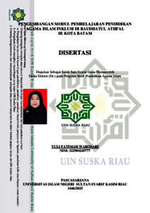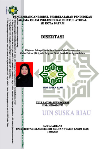 PENGEMBANGAN MODUL PEMBELAJARAN PENDIDIKAN AGAMA ISLAM INKLUSI DI RAUDHATUL ATHFAL SE KOTA BATAM Yuli Fatimah Warosari NIM. 32290424777 Disertasi, Program studi Pendidikan Agama Islam, Program Pascasarjana Universitas Islam Negeri Sultan Syarif Kasim Riau Pembimbing I/Promotor: Prof. Dr. H. Ilyas Husti, M.A. Pembimbing II/Co.Promotor: Dr. Zamsiswaya, M.Ag. ABSTRAK Penelitian ini bertujuan untuk mengembangkan modul pembelajaran Pendidikan Agama Islam inklusi untuk Raudhatul Athfal, dengan fokus pada kebutuhan siswa berkebutuhan khusus di Raudhatul Athfal Se Kota Batam. Melalui pendekatan Research and Development, penelitian ini mengikuti model pengembangan ADDIE (Analysis, Design, Development, Implementation, Evaluation) untuk memastikan modul yang dihasilkan relevan, efektif, dan adaptif. Temuan utama penelitian menunjukkan bahwa modul yang dirancang dengan pendekatan multisensori (visual, auditori, kinestetik) secara signifikan meningkatkan partisipasi dan pemahaman siswa. Modul ini juga mengintegrasikan teknologi pendidikan seperti perangkat lunak interaktif dan alat bantu digital yang dirancang khusus untuk mendukung pembelajaran inklusif. Selain itu, penelitian ini mengembangkan model pelatihan berkelanjutan bagi guru, yang mencakup strategi pengajaran inklusif dan penggunaan teknologi pendidikan. Kolaborasi antara sekolah, orang tua, dan komunitas menjadi aspek penting dalam menciptakan lingkungan belajar yang inklusif dan suportif. Kurikulum Pendidikan Agama Islam yang adaptif memungkinkan penyesuaian berdasarkan kebutuhan individual siswa, sementara sistem evaluasi berbasis umpan balik dari siswa, guru, dan orang tua memastikan modul terus diperbaiki dan disesuaikan dengan kebutuhan yang berubah. Implikasi dari penelitian ini mencakup peningkatan kualitas pendidikan Pendidikan Agama Islam di Raudhatul Athfal potensi replikasi dan adaptasi model dan modul di berbagai institusi pendidikan, serta pengaruh terhadap kebijakan pendidikan inklusif di tingkat nasional. Penelitian ini memberikan kontribusi penting dalam menciptakan sistem pendidikan yang lebih inklusif dan adil, memastikan bahwa setiap anak mendapatkan kesempatan yang sama untuk belajar dan berkembang sesuai dengan potensinya. Kata Kunci: Pendidikan Agama Islam, Pengembangan Modul, Inklusi, Raudhatul Athfal,