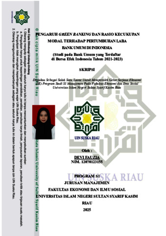 Devi Fauzia, Devi (2025) PENGARUH GREEN BANKING DAN RASIO KECUKUPAN MODAL TERHADAP PERTUMBUHAN LABA BANK UMUM DI INDONESIA (Studi pada Bank Umum yang Terdaftar di Bursa Efek Indonesia Tahun 2021-2023). Skripsi thesis, Universitas Islam Negeri Sultan Syarif Kasim Riau.
