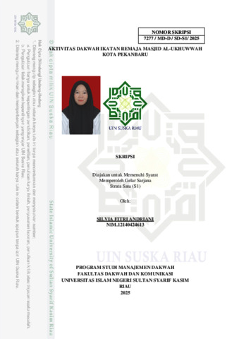 ABSTRAK Nama : Silvia Fitri Andriani NIM : 12140424613 Judul : Aktivitas Dakwah Ikatan Remaja Masjid Al-Ukhuwwah Kota Pekanbaru Latar belakang penelitian ini mengungkapkaan bagaimana proses aktivitas dakwah yang dilakukan oleh Ikatan Remaja Masjid Al-Ukhuwwah Kota Pekanbaru. Dalam aktivitas dakwah tersebut terdapat tiga pilar penting yaitu dakwah bil-Lisan, bil-Hal, bil-Qalam. Dalam penelitian ini digunakannya metode kualitatif dengan pendekatan deskriptif. Data-data dalam penelitian ini ditemukan dari hasil observasi langsung ke Masjid Al-Ukhuwwah. Kemudian dilakukannya wawancara dengan enam orang informan dan mengumpulkan dokumentasi sebagai penguat penelitian. Dari hasil penelitian ditemukan bahwa Ikatan Remaja Masjid Al-Ukhuwwah Kota Pekanbaru melakukan berbagai aktivitas dakwah diantaranya; Pertama, aktivitas Dakwah Bil Lisan yaitu pada kajian jumat malam, kajian remaja malam senin, kajian shubuh, tilawah qur‟an dan muhasabah akhir tahun. Kedua, aktivitas Dakwah Bil Hal yaitu berupa penyantunan anak yatim dan dhuafa, pembinaan praktek jenazah, bagi-bagi rezeki. Ketiga, dakwah Bil Qalam penggunaan media cetak dan online sebagai sarana dakwahnya seperti himbauan melalui spanduk dan pesan dakwah di sosial media baik Instagram maupun WhatsApp. Kata Kunci: Aktivitas Dakwah, Remaja