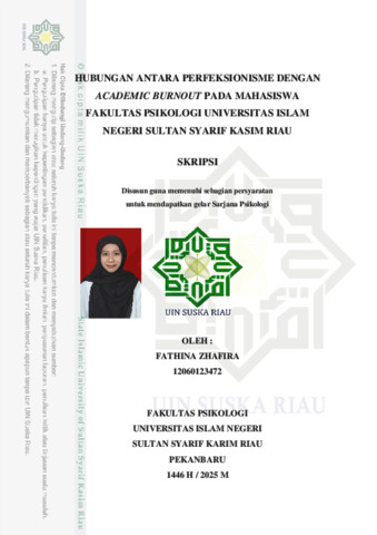 Hubungan antara Perfeksionisme dengan Academic Burnout pada Mahasiswa Fakultas Psikologi Universitas Islam Negeri Sultan Syarif Kasim Riau Fathina Zhafira (fathinazhafira01@gmail.com) Fakultas Psikologi Universitas Islam Negeri Sultan Syarif Kasim Riau ABSTRAK Mahasiswa perfeksionisme cenderung menetapkan standar yang tidak realistis dan merasa perlu untuk mencapai kesempurnaan dalam pencapaian akademik yang menyebabkan kelelahan ketika adanya perbedaan antara apa yang dicapai dengan standar yang dibuat. Mahasiswa dalam proses pembelajaran seringkali ingin mencapai kesempurnaan tersebut sehingga memungkinkan terjadinya academic burnout. Penelitian ini bertujuan untuk mengetahui hubungan antara perfeksionisme dengan academic burnout pada mahasiswa Fakultas Psikologi Universitas Islam Negeri Sultan Syarif Kasim. Pengambilan sampel menggunakan teknik stratified sampling dengan subjek penelitian sebanyak 159 mahasiswa Fakultas Psikologi Universitas Islam Negeri Sultan Syarif Kasim Riau. Pengumpulan data menggunakan dua skala, yaitu skala perfeksionisme (Hewitt and Flett Multidimensional Perfectionism Scale, Hewitt dan Flett, 1991) dan skala academic burnout (Maslach Burnout Inventory-Student Survey, Schaufeli dkk., 2002). Hasil penelitian menunjukkan bahwa perfeksionisme memiliki hubungan yang signifikan dengan academic burnout pada mahasiswa Fakultas Psikologi Universitas Islam Negeri Sultan Syarif Kasim. Dengan demikian, dapat ditarik kesimpulan bahwa perfeksionisme membuat mahasiswa mengalami academic burnout. Kata Kunci : Perfeksionisme, Academic Burnout, Mahasiswa