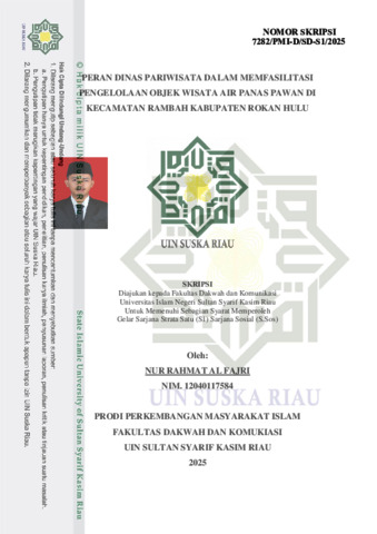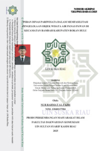 ABSTRAK Nama : Nur Rahmat Al Fajri NIM : 12040117584 Jurusan : Pengembangan Masyarakat Islam Judul : Peran Dinas Pariwisata Dalam Memfasilitasi Pengelolaan Objek Wisata Air Panas Pawan Di Kecamatan Rambah Kabupaten Rokan Hulu Peneltian ini dilatarbelakingi oleh eksistensi objek wisata air Panas Pawan di Desa Rambah Tongah Kabupaten Rokan Hullu. Objek wisata ini sudah ada seja tahun 2002 dan masih berkembang hingga saat ini. Fenomena dilapngan menunjukkan bahwa objek wisata air panas Pawan ini semakin berkembang dan menarim wisatawan sehingga memberikan dampak positif dalam membangun perekonomian masyarakat desa Rambah Tongah tetapi akses jalan masih belum memadai dan rusak. Penelitian ini bertujuan untuk mengetahui Peran Dinas Pariwisata Dalam Memfasilitasi Pengelolaan Objek Wisata Air Panas Pawan Di Kecamatan Rambah Kabupaten Rokan Hulu. Metodologi penelitian yang digunakan adalah kualitatif dengan jumlah informan sebanyak 8 orang. Teknik pengumpulan dalam penelitian ini antara lain : observasi,wawancara, dan dokumentasi untuk mendukung keaslian penelitian. Hasil penelitian menunjukkan bahwa : Dinas Pariwisata dalam pengelolaan objek wisata air panas Pawan di Kecamatan Rambah, Kabupaten Rokan Hulu adalah bahwa Dinas Pariwisata memainkan peran kunci dalam mengelola dan mengembangkan objek wisata ini secara berkelanjutan. Melalui peningkatan infrastruktur, promosi yang efektif, dan pelatihan kepada masyarakat lokal, Dinas Pariwisata dapat menarik lebih banyak wisatawan, yang berdampak pada peningkatan pendapatan masyarakat sekitar. Selain itu, pengelolaan yang melibatkan masyarakat lokal dan menjaga kelestarian alam akan memperkuat sektor pariwisata sebagai sumber ekonomi yang berkelanjutan. pengelolaan yang efektif dapat mendorong pertumbuhan sektor pariwisata yang berdampak langsung pada kesejahteraan masyarakat sekitar. Oleh karena itu, peran Dinas Pariwisata sangat penting dalam menciptakan pariwisata yang berkelanjutan dan memberikan manfaat ekonomi jangka panjang bagi masyarakat. pengelolaan yang baik dan upaya perbaikan jalan oleh pemerintah terkait diharapkan dapat mendorong peningkatan perekonomian masyarakat di sekitar objek wisata air panas Pawan. Kata Kunci : Dinas Pariwisata, Pengelolaan Objek Wisata