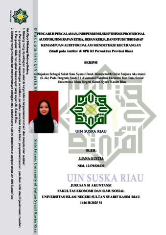INDEPENDENSI, SKEPTISISME PROFESIONAL AUDITOR, PENERAPAN ETIKA, BEBAN KERJA, DAN INTUISI TERHADAP KEMAMPUAN AUDITOR DALAM MENDETEKSI KECURANGAN (Studi pada Auditor di BPK RI Perwakilan Provinsi Riau) OLEH LIANA GUSTIA 12170320230 Penelitian ini bertujuan untuk menguji dan menganalisis Pengaruh Pengalaman, independensi, skeptisisme profesional auditor, penerapan etika, beban kerja, dan intuisi terhadap kemampuan auditor dalam mendeteksi kecurangan di BPK RI Perwakilan Provinsi Riau. Populasi dalam penelitian ini adalah Auditor pada Badan Pemeriksa Keuangan RI Perwakilan Provinsi Riau di Pekanbaru. Sampel dalam penelitian ini adalah purposive sample, dimana hanya auditor yang memenuhi kriteria pada Badan Pemeriksa Keuangan RI Perwakilan Provinsi Riau sebagai sampel. Penelitian ini menggunakan data primer dengan teknik angket (kuesioner) dan didapatkan sebanyak 94 responden dan yang memenuhi kriteria sebanyak 86 responden. Jenis penelitian ini adalah kuantitatif yang dianalisis menggunakan regresi linear berganda. Analisis yang dilakukan menggunakan SPSS versi 26. Hasil dari penelitian ini menunjukkan bahwa pengalaman, independensi, dan skeptisisme profesional auditor berpengaruh secara parsial dan secara simultan terhadap kemampuan auditor. Sedangkan penerapan etika, beban kerja, dan intuisi tidak berpengaruh secara parsial tetapi secara simultan berpengaruh terhadap kemampuan auditor. Besarnya pengaruh yang ditimbulkan Adjusted R-squared (R2) oleh keenam variabel ini secara bersamaan terhadap variabel terikatnya sebesar 44,7%, sedangkan sisanya sebesar 55,3% dipengaruhi oleh faktor-faktor yang tidak diamati dalam penelitian ini. Kata Kunci: Pengalaman, Independensi, Skeptisisme Profesional Auditor, Penerapan Etika, Beban Kerja, Intuisi, Kemampuan Auditor
