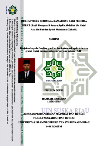 HAMSAH HARAHAP, - (2025) HUKUM TIDAK BERPUASA RAMADHAN BAGI PEKERJA BERAT (Studi Komparatif Antara Syekh Abdullah bin Abdul Aziz bin Baz dan Syekh Wahbah al-Zuhaili ). Skripsi thesis, UNIVERSITAS ISLAM NEGERI SULTAN SYARIF KASIM RIAU.