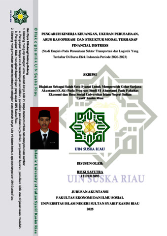 RISKI SAFUTRA, - (2025) PENGARUH KINERJA KEUANGAN, UKURAN PERUSAHAAN, ARUS KAS OPERASI DAN STRUKTUR MODAL TERHADAP FINANCIAL DISTRESS (Studi Empiris Pada Perusahaan Sektor Transportasi dan Logistik Yang Terdaftar Di Bursa Efek Indonesia Periode 2020-2023). Skripsi thesis, UNIVERSITAS ISLAM NEGERI SULTAN SYARIF KASIM RIAU.