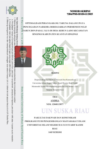ABSTRAK Nama : Andika Nim : 12040115077 Judul : Optimalisasi Peran Karang Taruna Dalam Upaya Pencegahan Narkoba Berdasarkan Permensos No.25 Tahun 2019 (Pasal 3 & 5) Di Desa Kebun Lado Kecamatan Singingi Kabupaten Kuantan Singingi. Penelitian ini dilatarbelakangi maraknya penyalahgunaan narkoba terutama di kalangan remaja, Remaja sering kali menjadi target sasaran perdagangan narkoba dan terpengaruh oleh tekanan lingkungan yang merangsang mereka untuk mencoba narkoba. Dampak negatif dari penyalahgunaan narkoba pada masa remaja dapat berdampak jangka panjang terhadap kesehatan fisik, kesejahteraan mental, dan perkembangan sosial mereka. Oleh karena itu, penting untuk melibatkan berbagai pihak dalam upaya pencegahan dan penanggulangan penyalahgunaan narkoba, salah satunya adalah melalui peran karang taruna. Penelitian ini menggunakan metode kualitatif deskriptif dengan mewawancarai 7 informan. Proses pengumpulan data yakni dengan melakukan observasi, wawancara, dan dokumentasi. Adapun yang peneliti gunakan pada teknik analisis data yaitu pengumpulan data, reduksi data, penyajian data, dan kesimpulan. Dari hasil penelitian yang peneliti lakukan dapat disimpulkan bahwa : Kasus penyalah gunaan narkoba di Desa Kebun Lado Kecamatan Sengingi pada tahun 2020-2023 terdapat peningkatan yaitu (4, 6, 10 orang terkasus), dan pada tahun 2024 terdapat penurunan dari pada tahun 2023 yaitu penurunan sebanyak 3 orang yang menyalahgunakan narkoba (7 orang), dan pada bulan April 2025 belum ada yang terdata dalam penyalahgunaan narkoba di Kecamatan Sengingi, dari kasus diatas dapat dilihat bahwasanya karang taruna menjalankan perannya secara optimal karena walaupun dari tahun 2020-2023 terdapat peeningkatan yang menggunakan narkoba tetapi pada tahun 2024 terjadi penurunan penggunaan narkoba dan pada pertengahan tahun 2025 belum ada yang terdata sebagai pengguna narkoba di Desa Kebun Lado Kecamatan Sengingi. Kata Kunci : Optimalisasi Peran, Karang Taruna, Pencegahan Narkoba.
