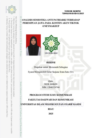 NUR ASIKIN, - (2025) ANALISIS SEMIOTIKA ANTI PATRIARKI TERHADAP PEREMPUAN JAWA PADA KONTEN AKUN TIKTOK @NEYMAKEUP. Skripsi thesis, Universitas Islam Negeri Sultan Syarif Kasim Riau.