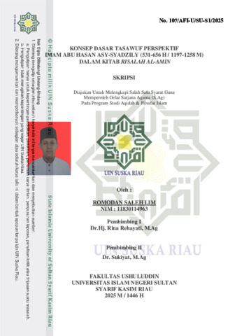 ABSTRAK Skripsi ini me. mbahas Konse. p Dasar Tasawuf pe. rspe. ktif Imam Abu Hasan Asy-Syadzily dalam karyanya Risalah al-Amin. Pe. ngkajian Tasawuf, didasarkan pada asumsi bahwa praktik tasawuf te. lah dilaksanakan ole. h kaum muslim te. rdahulu, baik para sahabat Nabi Saw, para tabiin, dan tabi‟tabiin, se. rta orangorang yang hidup se. te. lah itu. Tujuan pe. ne. litian ini untuk me. nge. mukakan konse. p dasar tasawuf pe. rspe. ktif Imam Abu Hasan Asy-Syadzily yang se. cara kritis me. lihat ke. hidupan manusia yang te. lah jauh dari ke. islaman. Imam Abu Hasan Asy-Syadzili me. nawarkan Tasawuf se. bagai solusi pe. nye. le. saian pe. rmasalahan krisis psikhis manusia, me. ngajak manusia me. nge. nal dirinya se. ndiri, le. bih me. nge. nal Tuhannya guna me. ndapatkan pe. tunjuk-Nya. Tasawuf pada saat ini le. bih me. ne. kankan ke. pada re. konstruksi sosio-moral masyarakat, se. hingga pe. ne. kanannya le. bih inte. ns pada pe. nguatan iman bahwa ke. hidupan duniawi sama pe. ntingnya de. ngan ke. hidupan ukhrawi. Me. lalui tasawuf manusia akan le. bih te. nang dan sabar dalam me. nghadapi ke. hidupan. Pe. rmasalahan dalam pe. ne. litian ini te. ntang macam-macam tasawuf, dan konse. p dasar Tasawuf pe. rspe. ktif Imam Abu Hasan Asy-Syadzili. Pe. rmasalahan te. rse. but dite. laah me. nggunakan pe. ne. litian kualitatif de. skriptif dari data ke. pustakaan, library re . se. arch se. bagai je. nisnya, pe. nde. katan se. cara filosofis sufistik untuk me. nganalisis pe. rmasalahan. Sumbe. r utama dari pe. ne. litian ini adalah kitab yang be. rjudul Risalah al-Amin. Pe. ngumpulan data pada pe. ne. litian ini me. lalui pe. ngumpulan buku prime. r dan se. kunde. r, artike. l jurnal, dan hasil pe. ne. litian. Dari data yang dipe. role. h ke. mudian dire. duksi, dianalisis, lalu disajikan dalam be. ntuk uraian. Dari pe. ne. litian ini, dike. tahui bahwa te. rdapat dua macam tasawuf yaitu: Pertama Tasawuf Akhlaki be. rupa e. tika, ke. te. ladanan, dan tawadhu. Kedua, tasawuf amali, be. rupa istighfar, zikir, dan wirid. Se. lanjutnya, konse. p dasar tasawuf pe. rspe. ktif Imam Abu Hasan Asy-Syadzily yaitu: Uzlah, tobat, zuhud, tawakkal, sabar, syukur, wara', ikhlas, mahabbah, dan muraqabah. Kata Kunci: Konsep,Tasawuf, Imam Abu Hasan asy-Syadzily