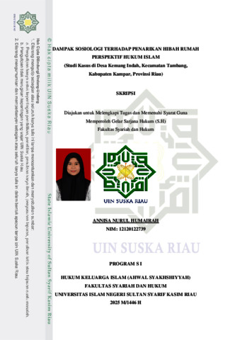 ANNISA NURUL HUMAIRAH, - (2025) DAMPAK SOSIOLOGI TERHADAP PENARIKAN HIBAH RUMAH PERSPEKTIF HUKUM ISLAM (Studi Kasus di Desa Kemang Indah, Kecamatan Tambang, Kabupaten Kampar, Provinsi Riau). Skripsi thesis, UNIVERSITAS ISLAM NEGRI SULTAN SYARIF KASIM RIAU.